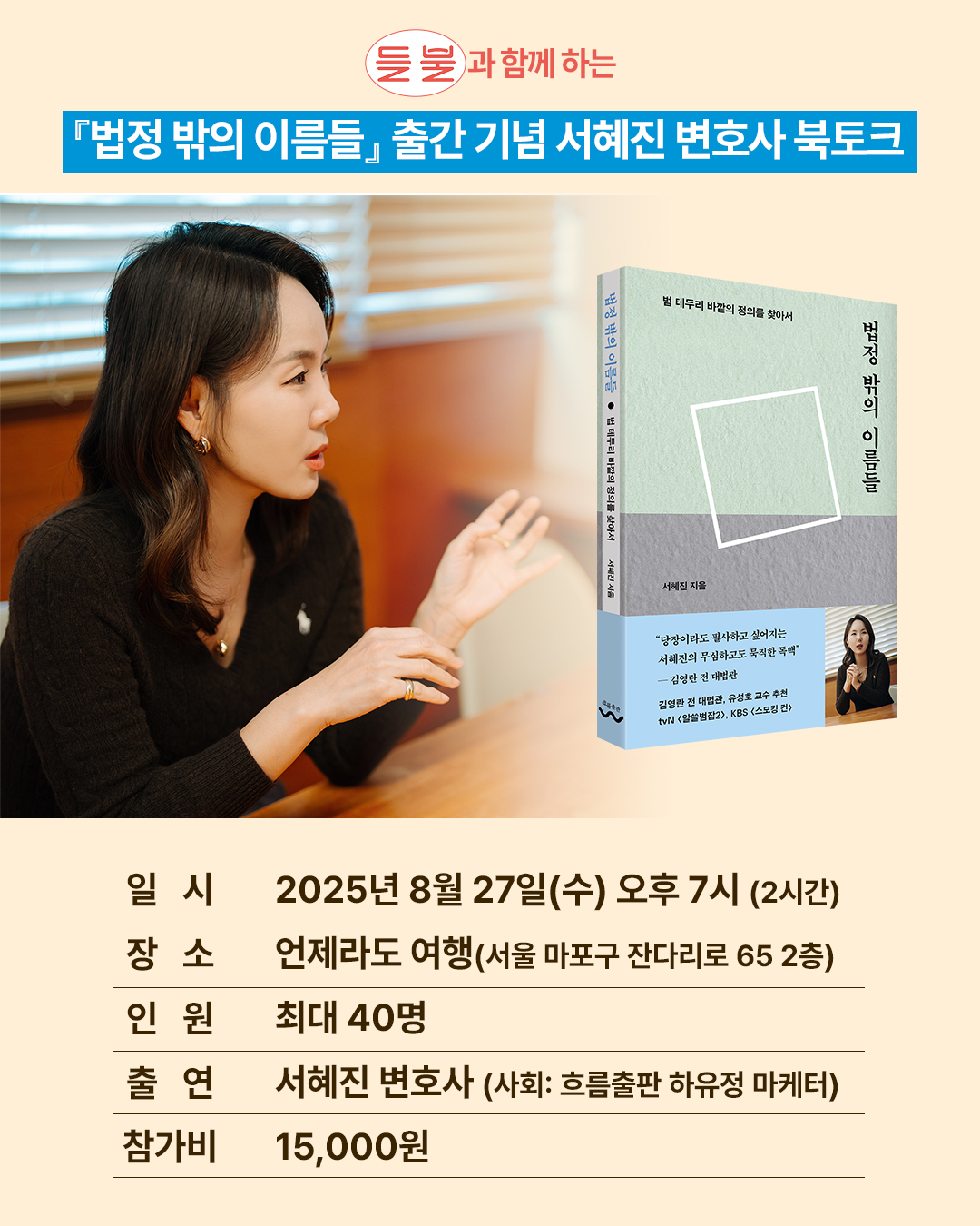 🔹일시: 2025년 8월 27일 오후 7시 (2시간) 🔹장소: 언제라도 여행 (서울 마포구 잔다리로 65 2층) 🔹인원: 최대 40명 🔹출연: 서혜진 변호사(사회: 흐름출판 하유정 마케터)