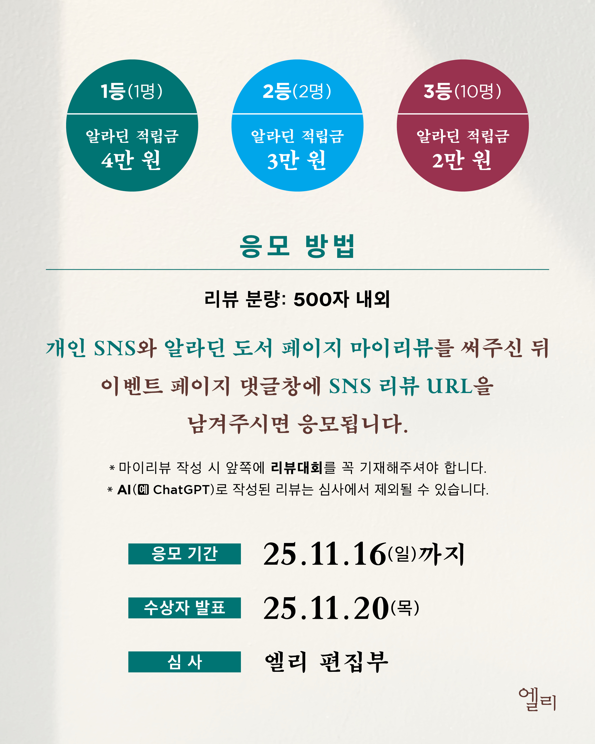 알라딘에서 《의미들》 리뷰 대회를 진행 중입니다! 개인 SNS와 알라딘 도서 페이지 마이리뷰를 써주신 뒤 이벤트 페이지 댓글창에 SNS 리뷰 URL을 남겨주시면 응모가 완료된다고 해요. 응모기간은 11월 16일 일요일까지이고, 분량은 500자 내외로 짧습니다! 알라딘 적립금을 최대 4만원까지 받아볼 수 있는 좋은 기회이니, 관심 있으신 분들은 바로 알라딘으로 달려가 보세요! 👀 |