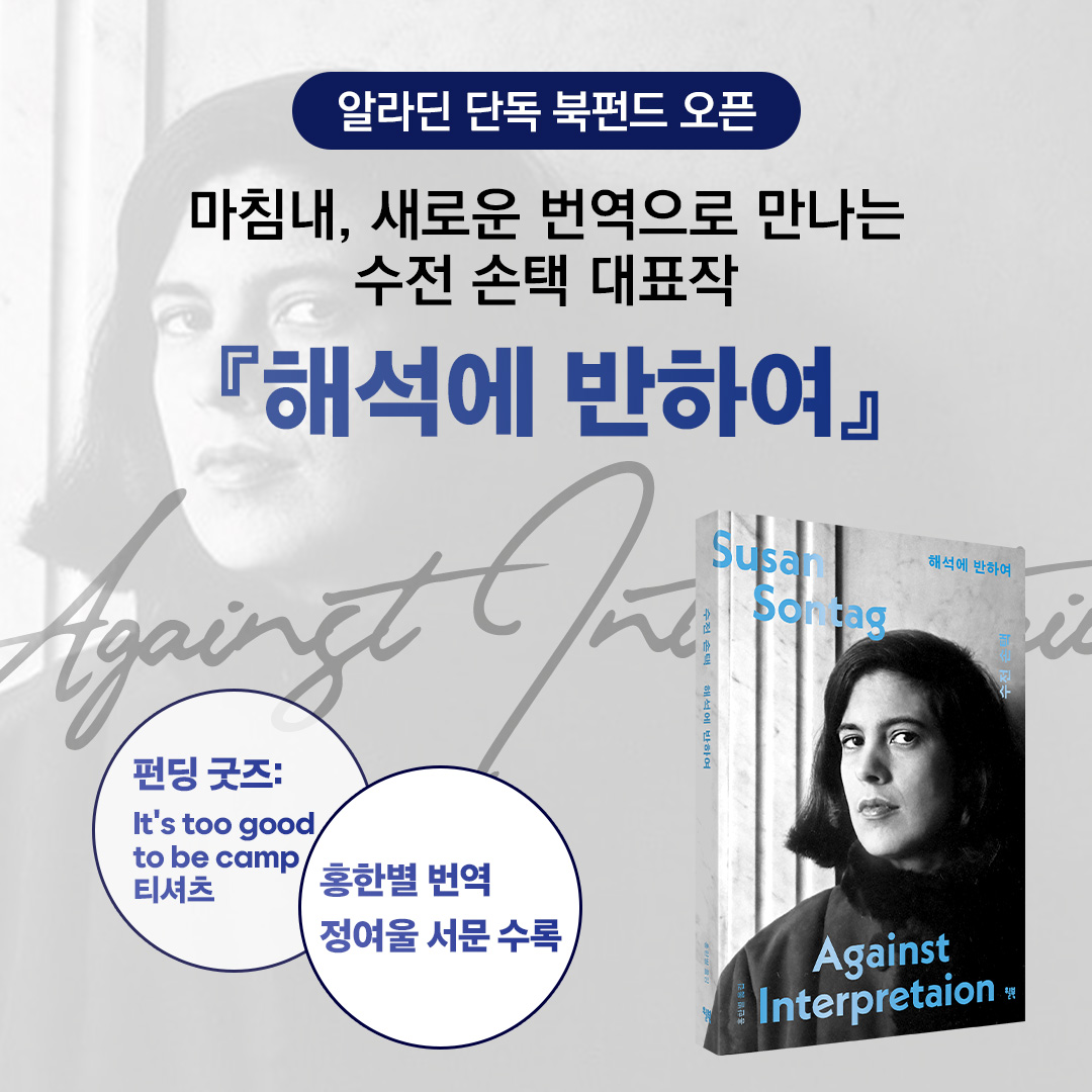 오늘은 수전 손택의 대표작이자 첫 번째 에세이집인 『해석에 반하여』의 내용 일부를 살펴보았습니다. 예술과 세계를 바라보는 새로운 관점을 제시한 현대 문화비평의 혁명적 고전인 『해석에 반하여』가 지금 알라딘에서 북펀딩을 진행하고 있다고 해요. 카뮈, 장 뤽 고다르, 비틀스, 정신분석과 종교, SF영화에 이르기까지 다양한 주제를 넘나든 손택의 논평을 이 책을 통해 지금 바로 만나보세요! |